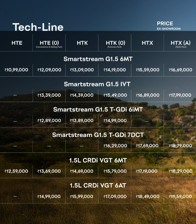 2026 Kia Seltos की पूरी प्राइस लिस्ट अलग-अलग वेरिएंट्स के हिसाब से उपलब्ध कराई गई है।