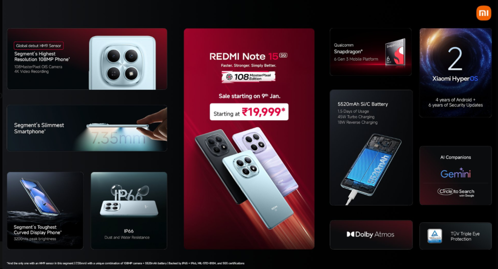 Redmi ने नए साल की शुरुआत भारत में दो दमदार डिवाइसेज़ के साथ की है। कंपनी ने Redmi Note 15 5G और Redmi Pad 2 Pro 5G को लॉन्च कर दिया है। दोनों ही डिवाइस बड़ी बैटरी, पावरफुल डिस्प्ले और शानदार फीचर्स के साथ आते हैं, वो भी किफायती कीमत में। Redmi Note 15 5G की शुरुआती कीमत Rs 19,999 रखी गई है, जबकि Redmi Pad 2 Pro 5G की कीमत Rs 22,999 से शुरू होती है। आइए जानते हैं दोनों डिवाइसेज़ की पूरी डिटेल।