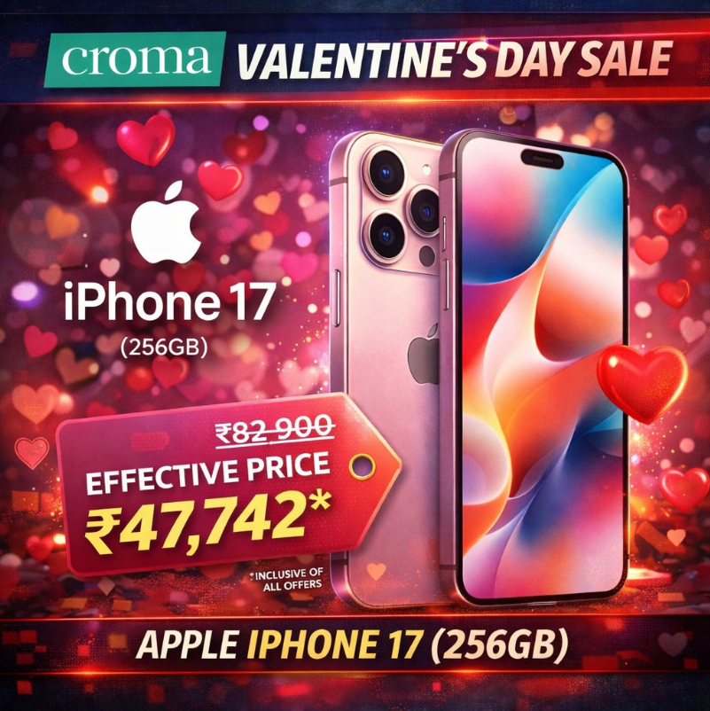 वैलेंटाइन डे नजदीक आते ही इलेक्ट्रॉनिक्स खरीदने वालों के लिए बड़ी खुशखबरी है। टाटा ग्रुप की रिटेल कंपनी Croma ने भारतभर में अपने सभी स्टोर्स पर Valentine’s Day Promotional Sale की घोषणा की है, जिसमें Apple iPhone 17 समेत कई पॉपुलर स्मार्टफोन्स, टैबलेट्स, वियरेबल्स और ऑडियो प्रोडक्ट्स पर जबरदस्त छूट दी जा रही है। इस सेल की सबसे बड़ी खासियत है कि लेटेस्ट iPhone 17 अब भारी डिस्काउंट के साथ खरीदा जा सकता है।